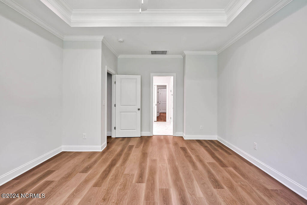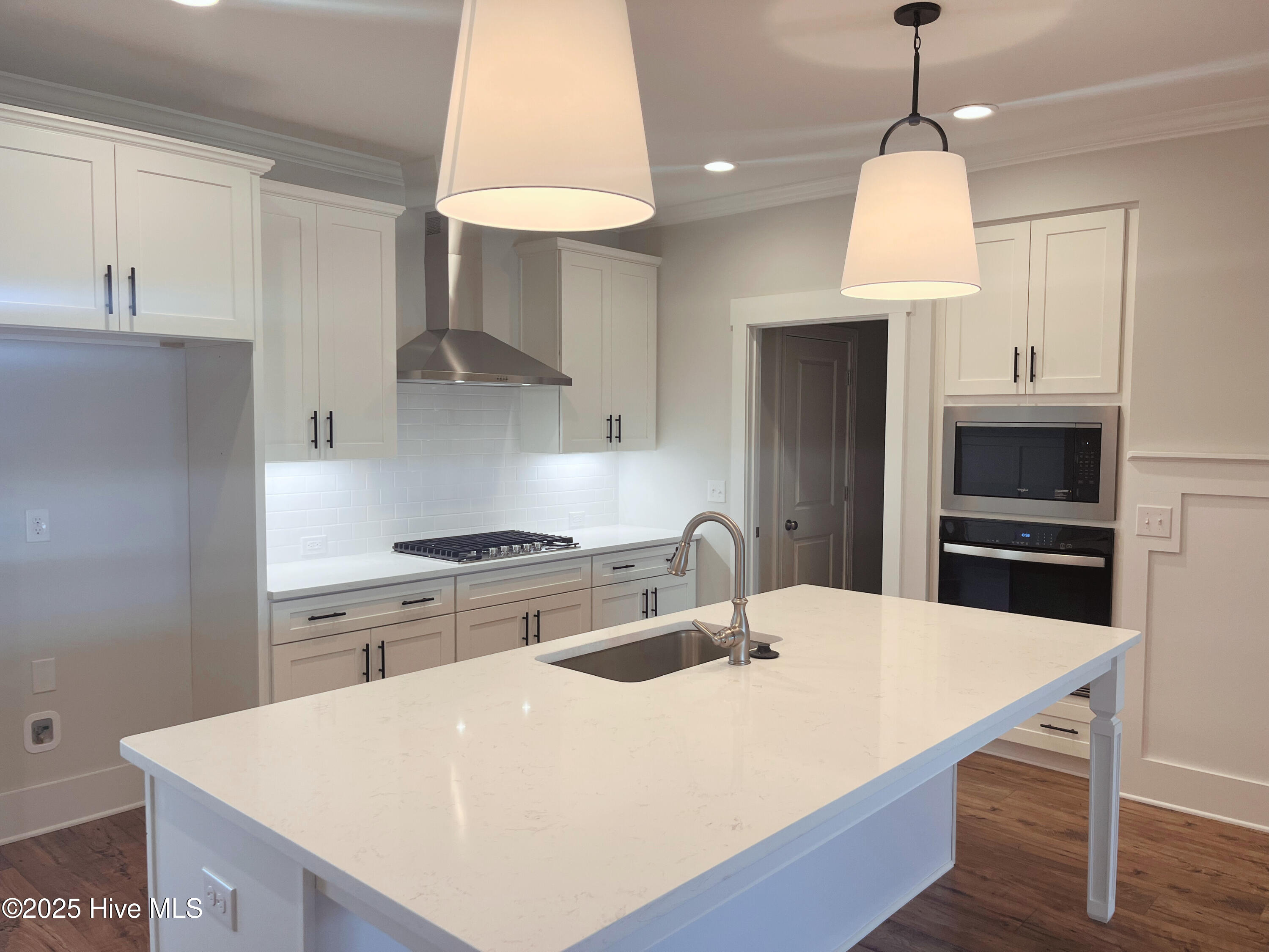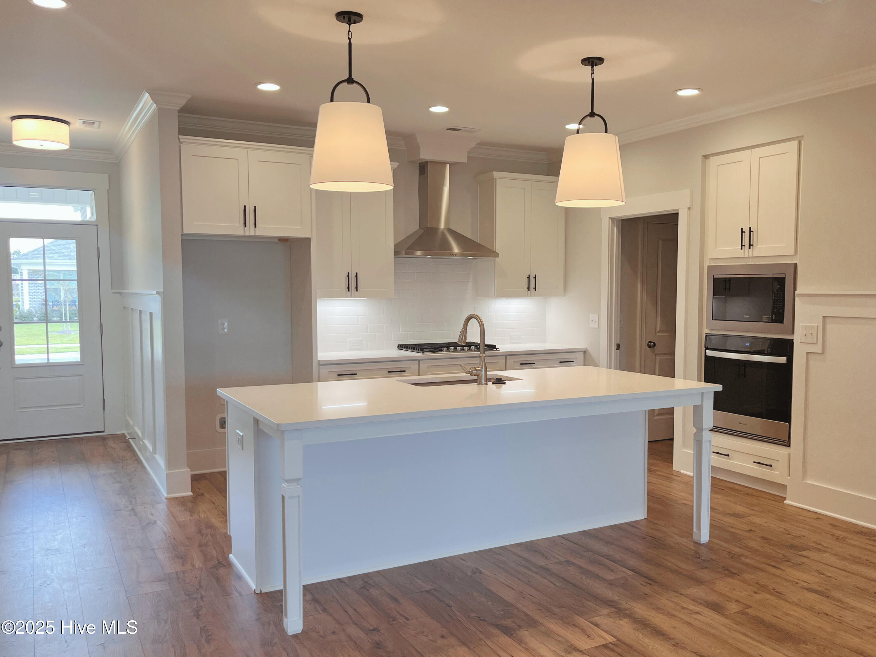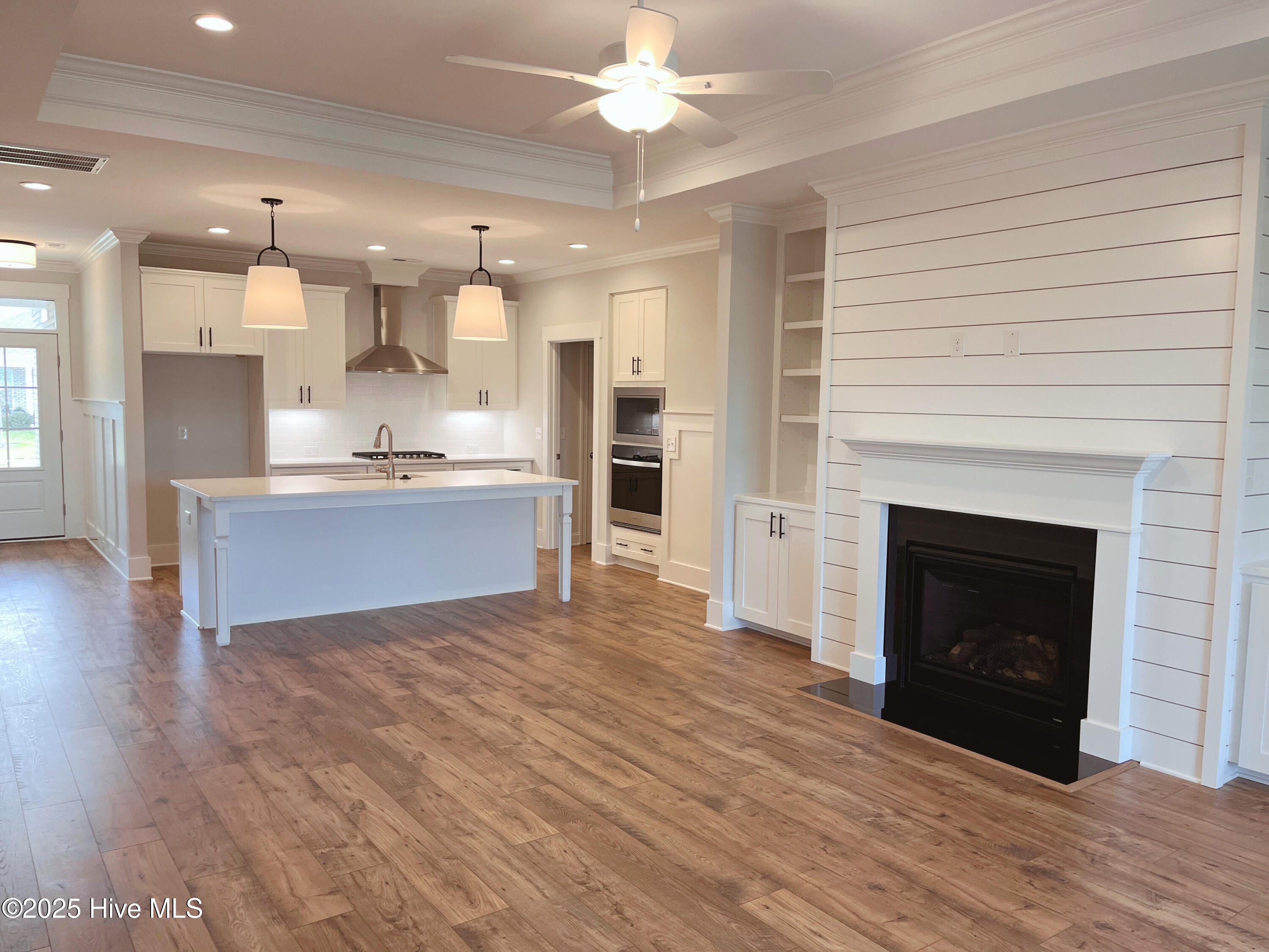 Low-maintenance laminate flooring extends throughout the open-concept living space, seamlessly connecting the dining room, great room, and kitchen. The great room features a tray ceiling, gas fireplace, and custom built-ins that add both function and style. At the heart of the home, the kitchen blends timeless white cabinetry with quartz countertops, a tile backsplash, a gas cooktop with wall oven and microwave, and a large center island ideal for casual entertaining. A generous pantry and additional storage are thoughtfully located in the laundry room, which conveniently connects directly to the primary suite's walk-in closet.