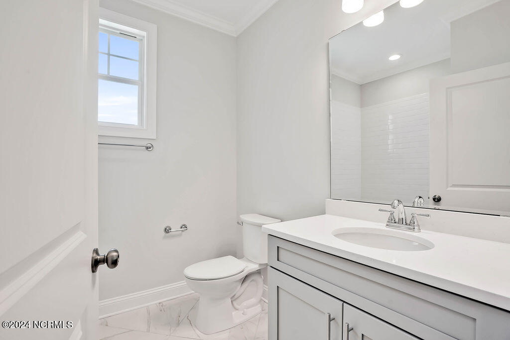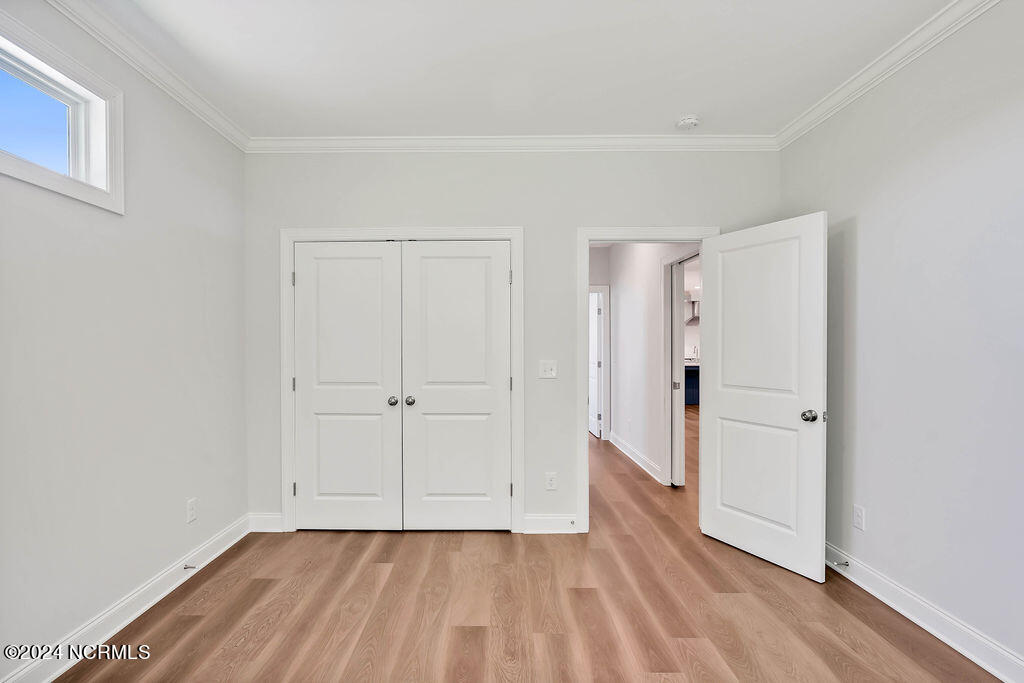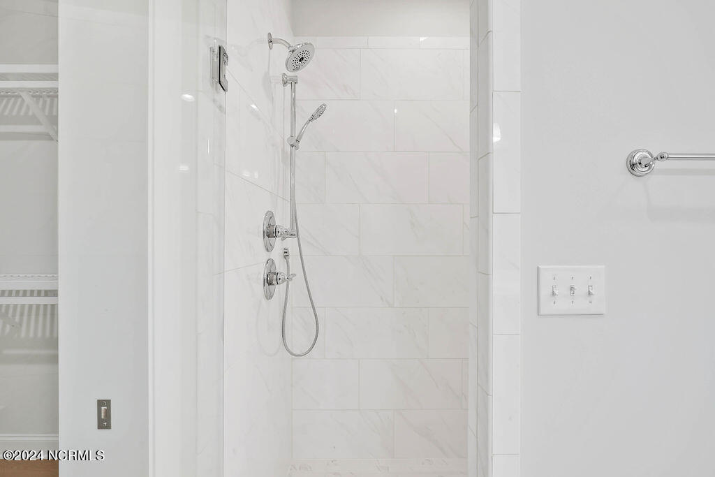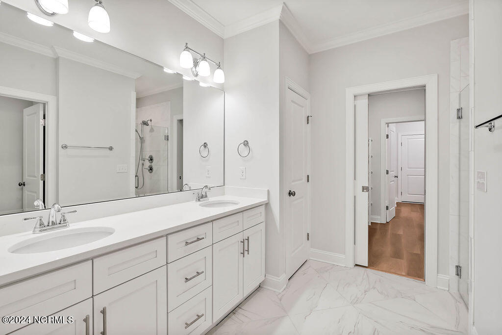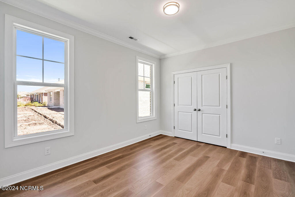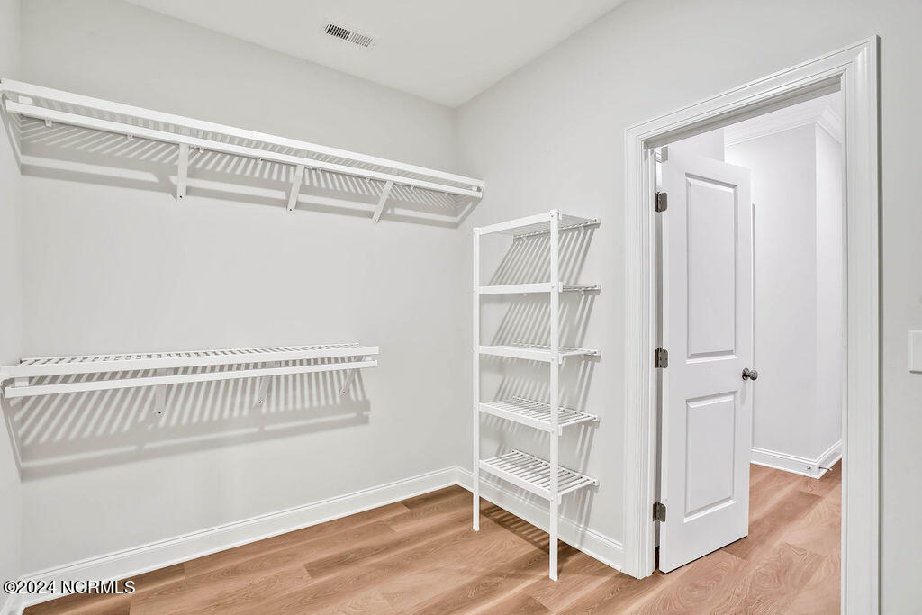 The private primary suite is a true retreat, featuring a tray ceiling, walk-in closet with wood slat shelving, and a spa-like bath with a fully tiled walk-in shower, double vanity, linen closet, and private water closet. Two spacious guest bedrooms share a full hall bath, offering comfort for family and visitors alike.