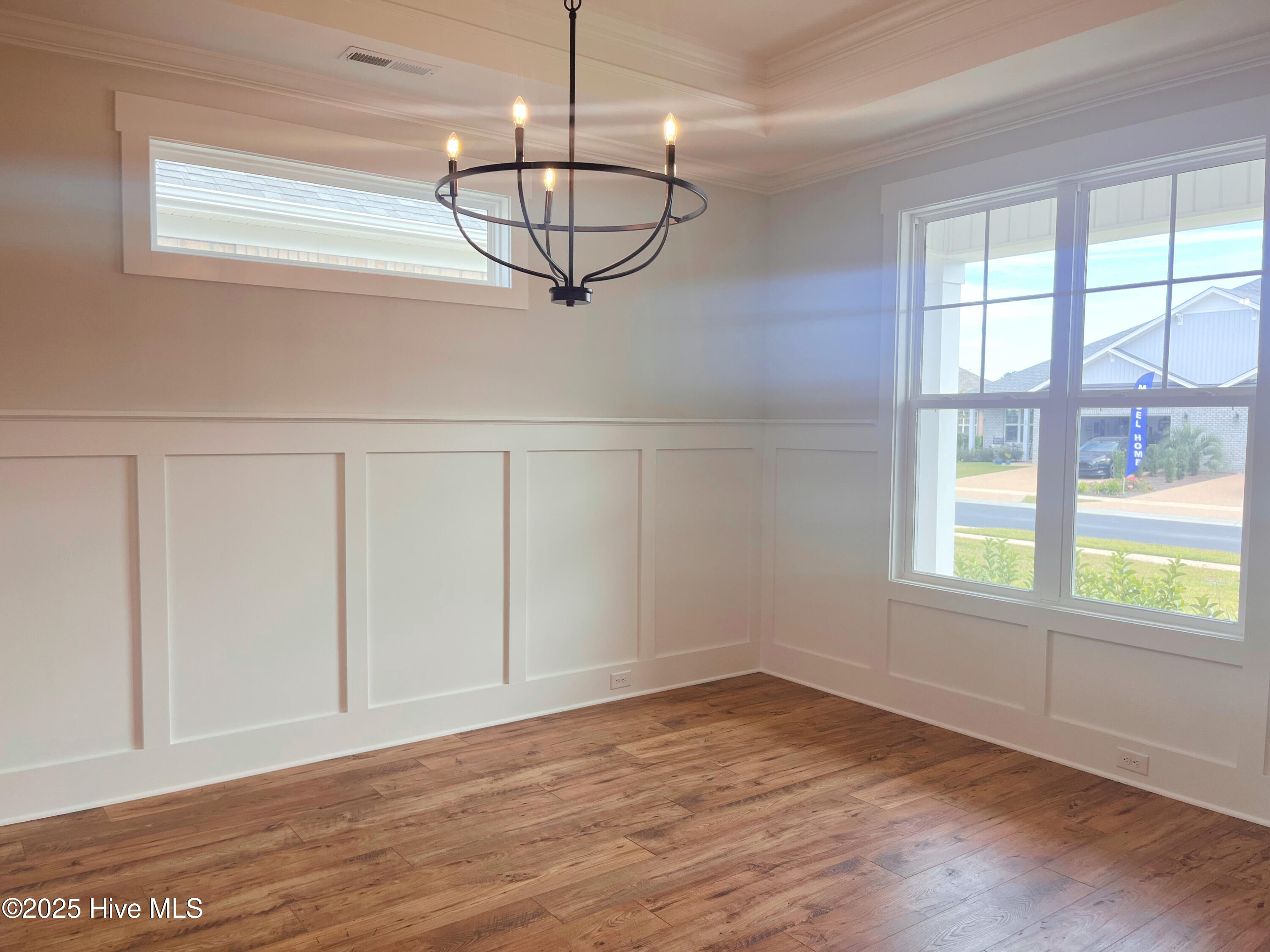 Enjoy all the benefits of new construction with this beautifully designed villa by American Homesmith, offering a relaxed, maintenance-free lifestyle in the amenity-rich community of Palmetto Creek. A charming rocking chair front porch welcomes you home, setting the tone for the warmth and comfort that await inside. The foyer flows into a formal dining area highlighted by elegant wainscoting and a tray ceiling, creating the perfect setting for gatherings.